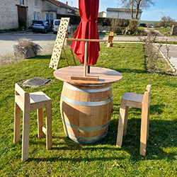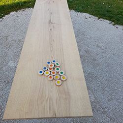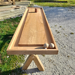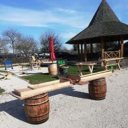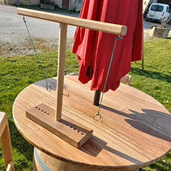 - Chaque jeu fait l'objet d'un assemblage méticuleux en bois massif (essentiellement chêne, frêne, hêtre issus de nos belles forêts de Meuse, d'Aube et de Haute-Marne) ainsi que d'une finition de qualité dans mon atelier, afin que ceux-ci soient un plaisir à regarder, à toucher et surtout à utiliser en toute sécurité. Les choix des matériaux assurent une résistance accrue aux intempéries et à l'usure du temps, ce qui me permet d'être serein lors des locations.